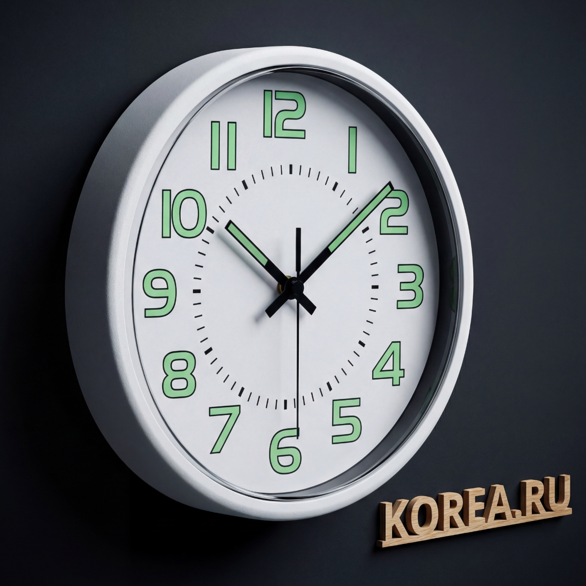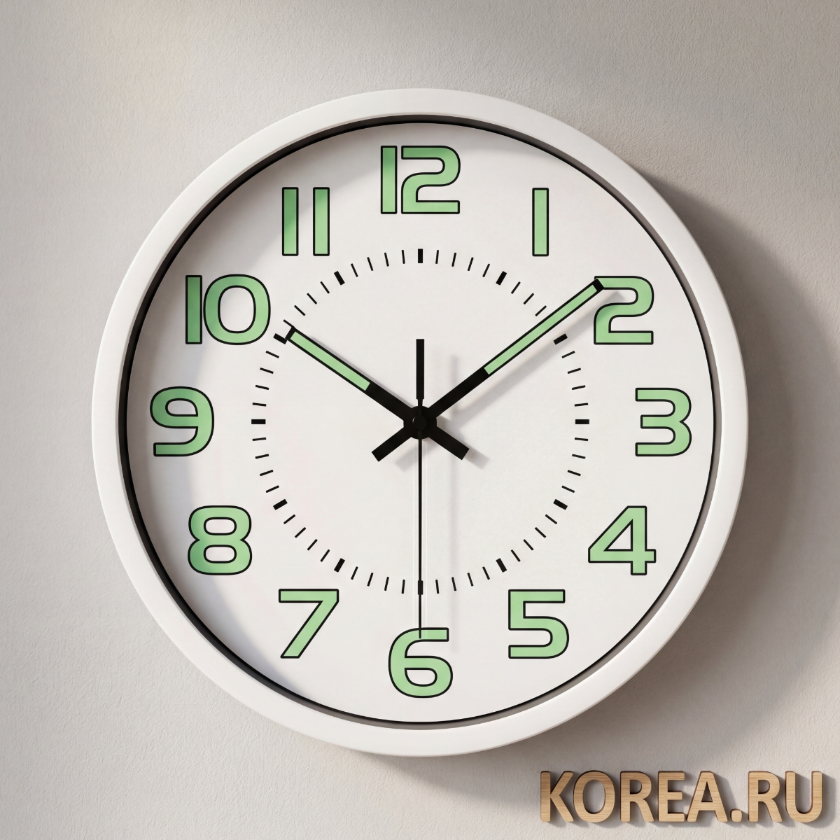 Современный минимализм: Сдержанная цветовая гамма (белый корпус, черные стрелки, зеленые цифры) идеально вписывается в интерьеры в стиле минимализм и современный дизайн.