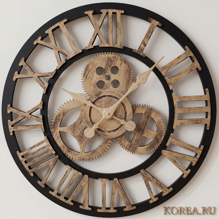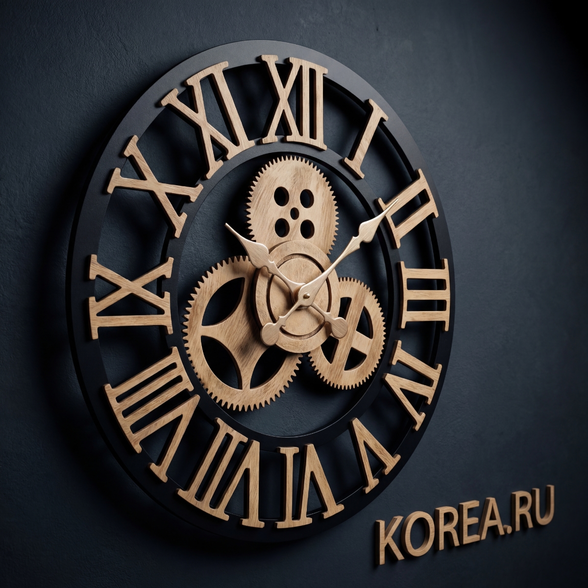 Лофт: Сочетание черного, коричневого дерева и механического оформления идеально соответствует эстетике лофта. Часы будут органично выглядеть на кирпичной стене или фоне голого бетона.