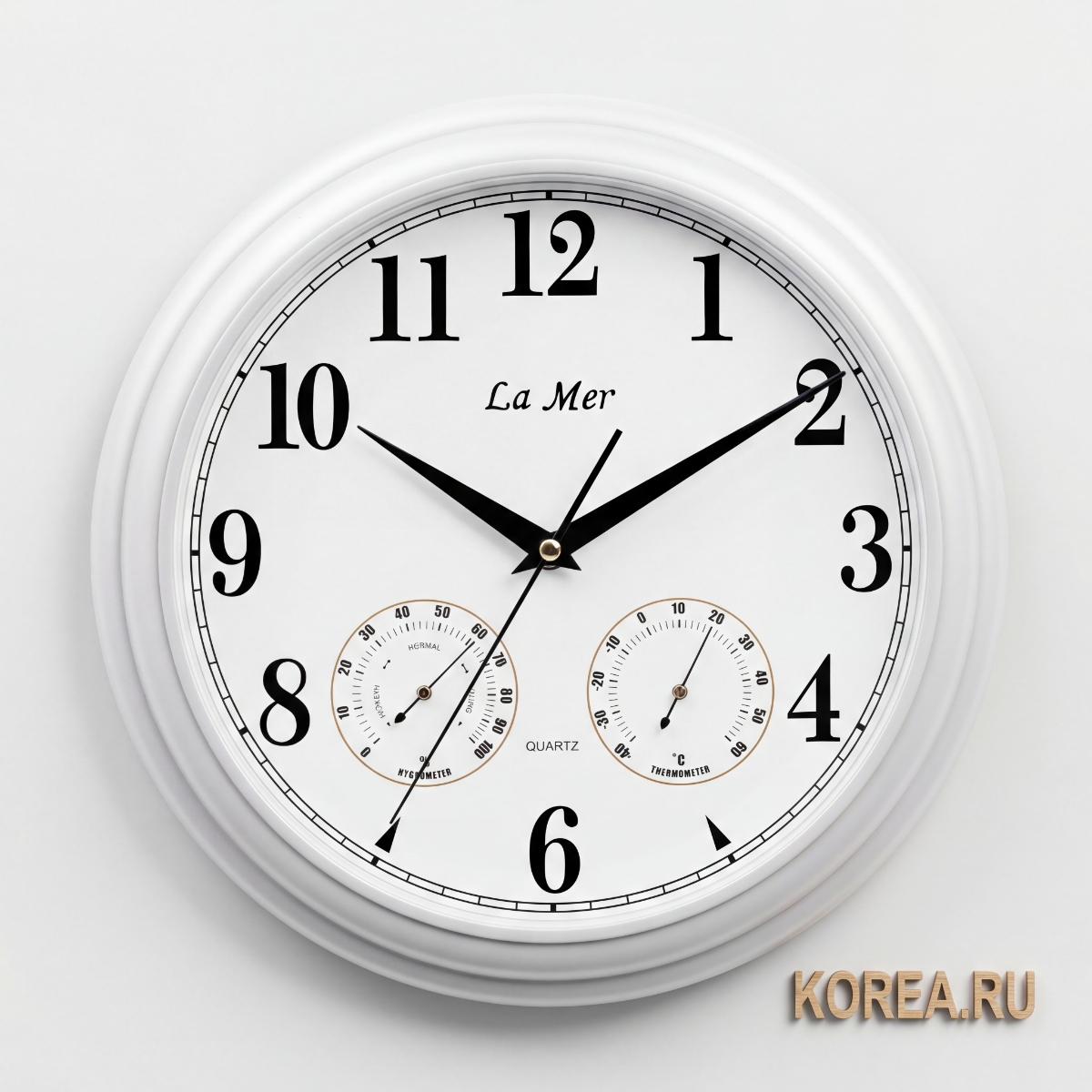 Ключевой особенностью модели является наличие встроенных гигрометра и термометра, которые позволяют одновременно контролировать влажность воздуха и температуру в помещении. Механизм плавного хода обеспечивает бесшумную работу часов, что делает их идеальным выбором для спален, офисов и жилых помещений.