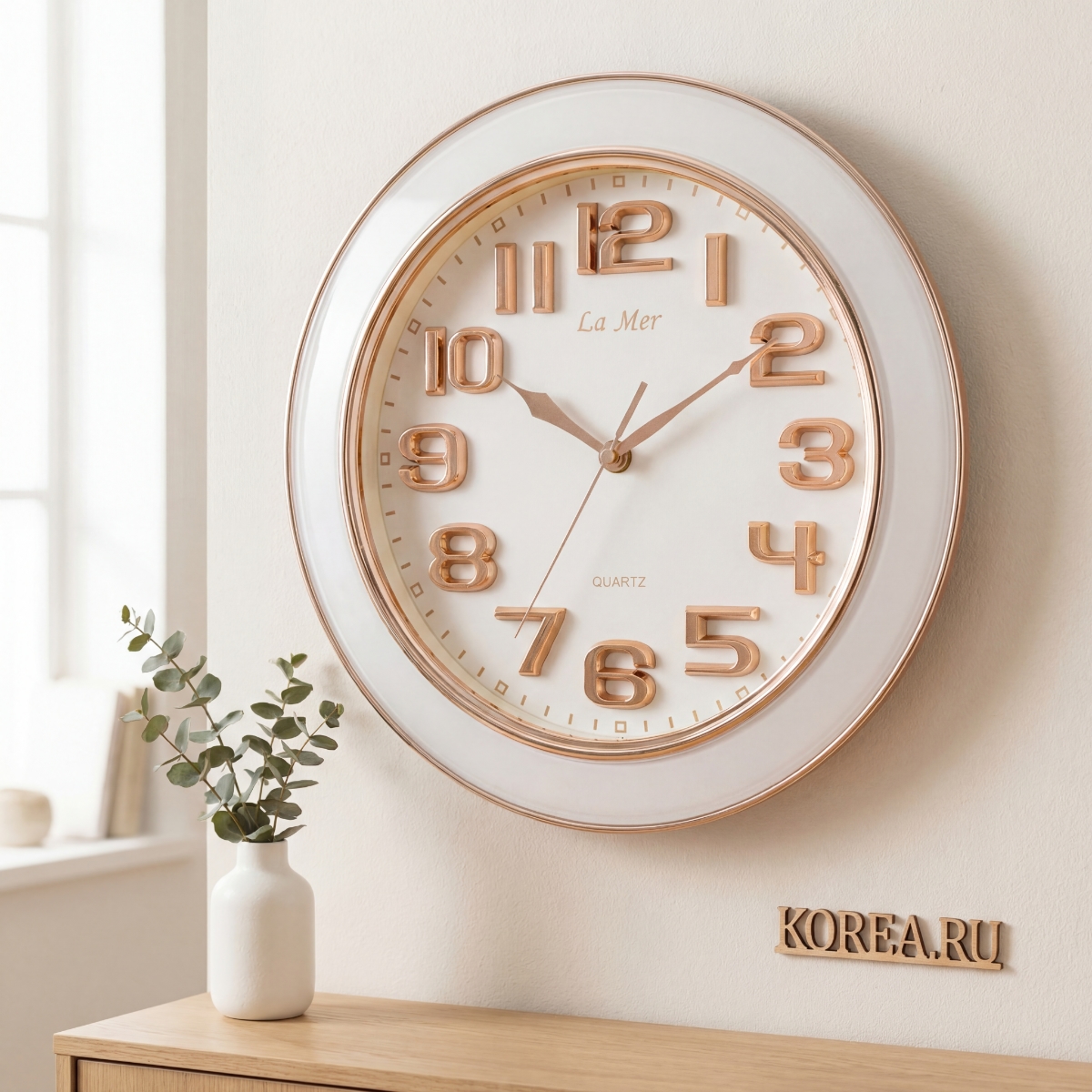 La Mer GD003052 — это стильные настенные часы, сочетающие минимализм и практичность. Модель отличается универсальным дизайном с четкими арабскими цифрами, удобной для мгновенного определения времени. Лаконичный циферблат на белом фоне с элементами розового золота создает гармоничный образ, актуальный для различных интерьеров.
