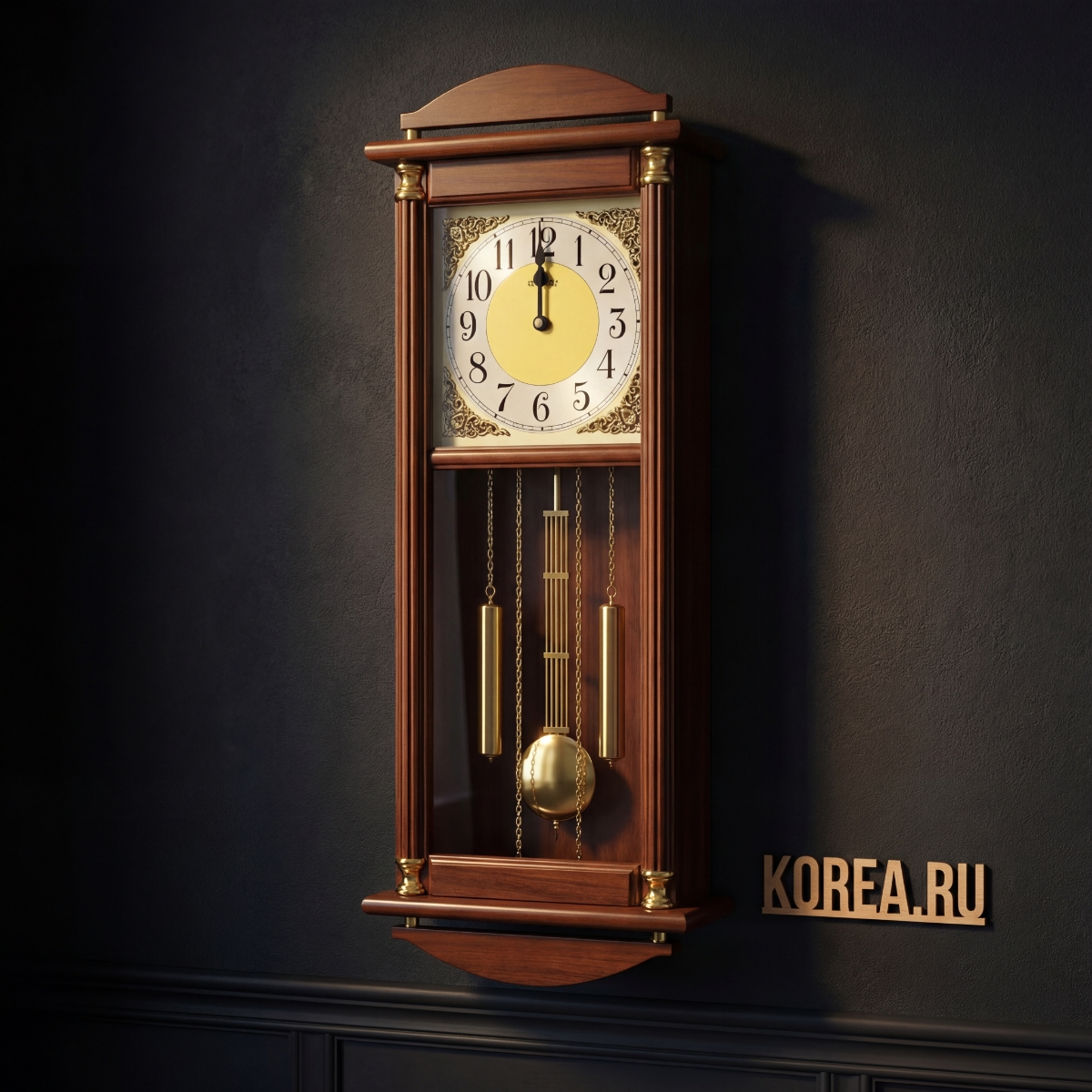 Размеры и материалы: Часы имеют прямоугольную форму с впечатляющими габаритами 890×320×150 мм, что делает их заметным декоративным элементом. Корпус выполнен из экологичного материала MDF в классическом коричневом цвете, который легко вписывается в существующий интерьер.
