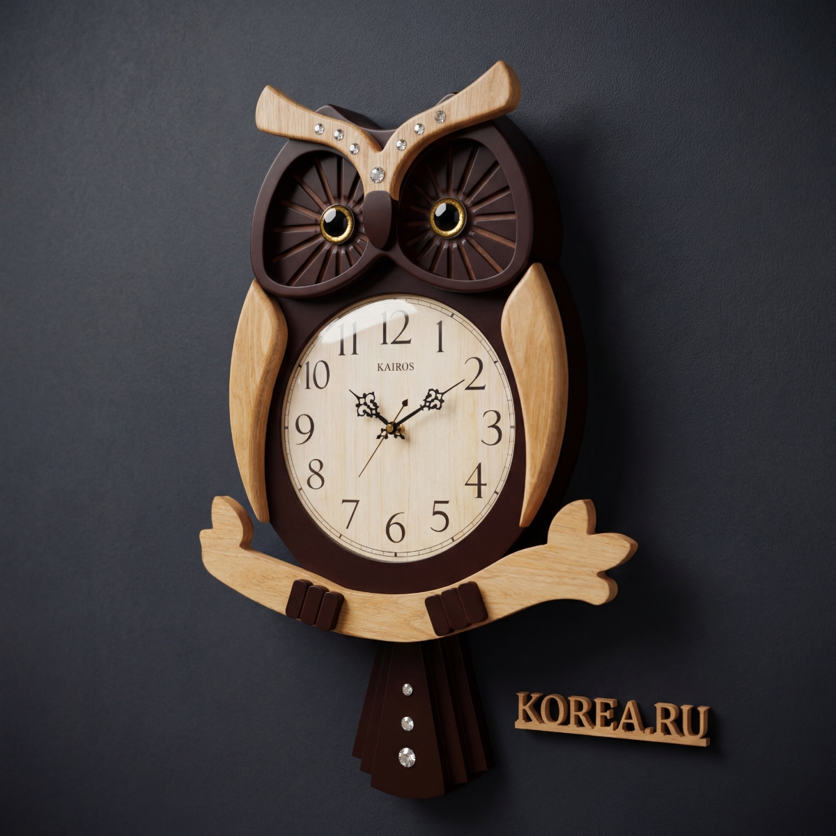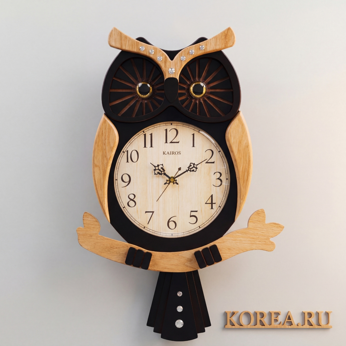 Корпус часов имеет характерную форму совы с выразительными круглыми глазами и деревянными ушками, украшенными декоративными стразами. Темно-коричневый (почти черный) корпус контрастирует с теплыми деревянными элементами из светлого дерева, создавая гармоничный и привлекательный облик. Глаза совы выполнены с золотистым ободком, что придает часам утонченность и изысканность. Характерной особенностью модели является маятник в виде нижней части туловища совы, который изящно раскачивается, создавая уникальный визуальный эффект движения.