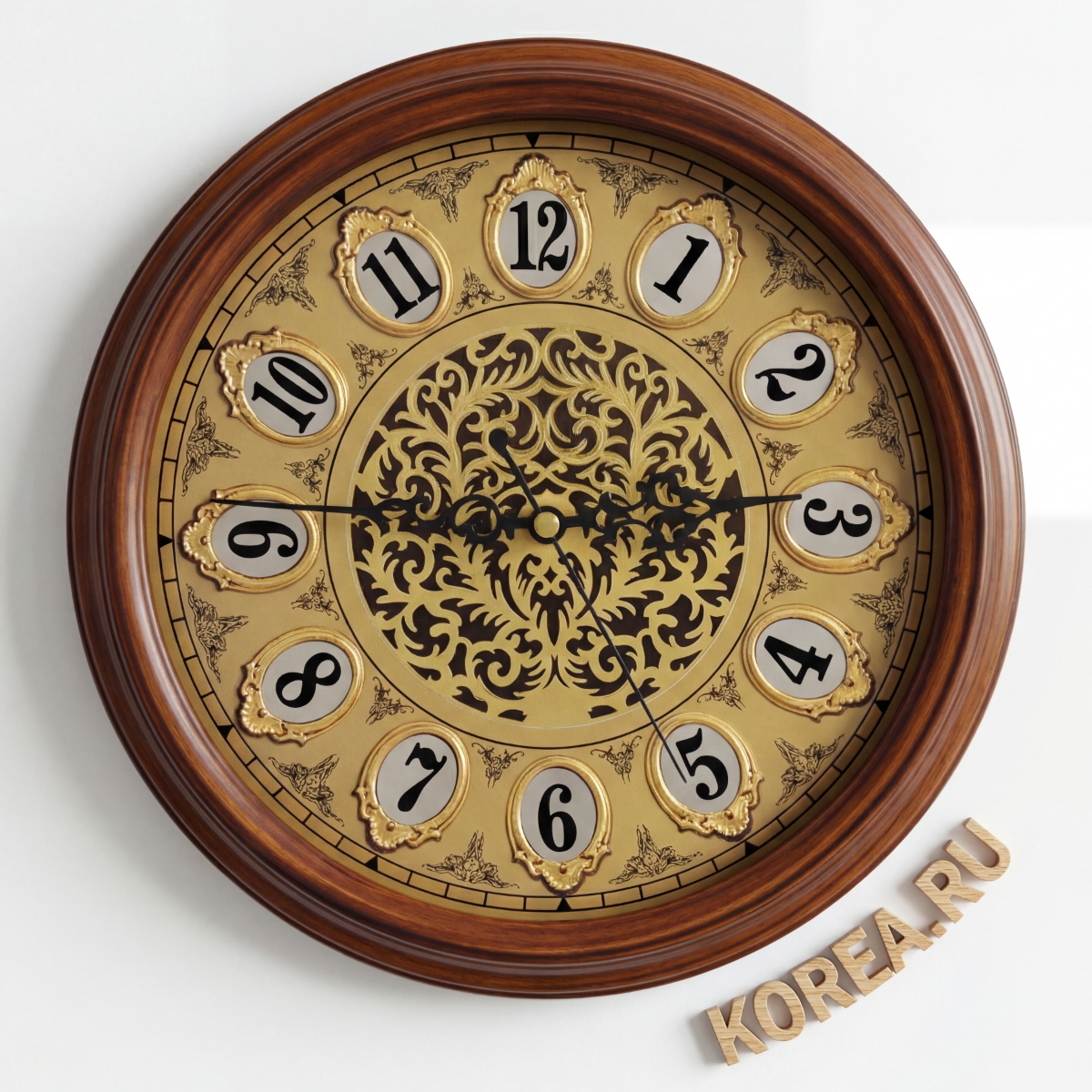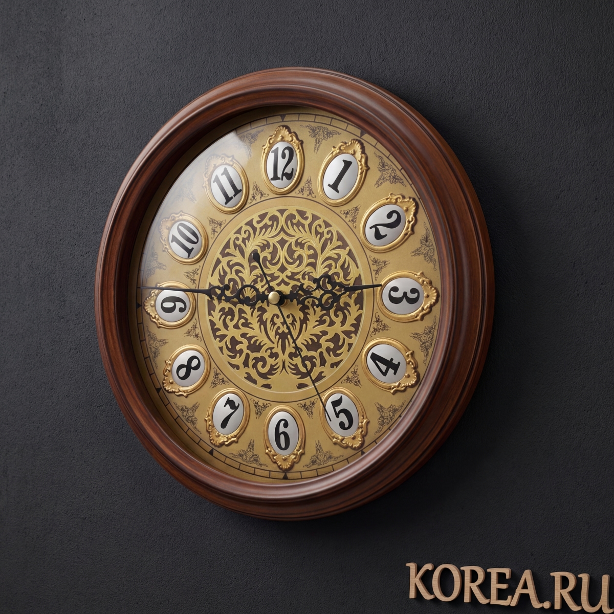 Циферблат часов KAIROS KS 2031B выполнен в золотистой палитре с элегантными арабскими цифрами, расположенными в декоративных картушах. Центральная часть оформлена сложным растительным орнаментом черного цвета, что придает изделию выраженный классический характер. Круглая форма корпуса и натуральный коричневый цвет дерева создают ощущение надежности и престижа.