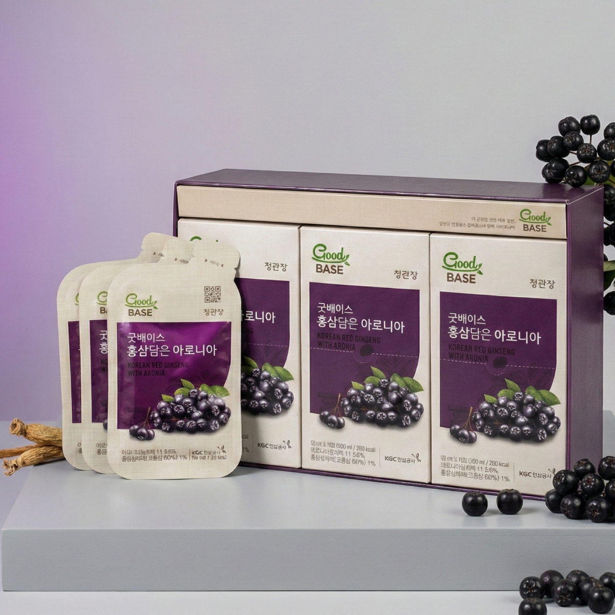 Арония известна как одна из самых богатых антоцианами ягод и ценится за высокий природный антиоксидантный потенциал, из-за чего её часто относят к суперфудам. В сочетании с 6‑летним корнем красного корейского женьшеня от Korea Ginseng Corporation это превращает напиток в современную интерпретацию традиционных корейских рецептов с акцентом на качество сырья и мягкий вкус. Марка CheongKwanJang, специализирующаяся на женьшеневой продукции, известна строгим контролем этапов выращивания и переработки корня, что ценится любителями аутентичных корейских продуктов.
