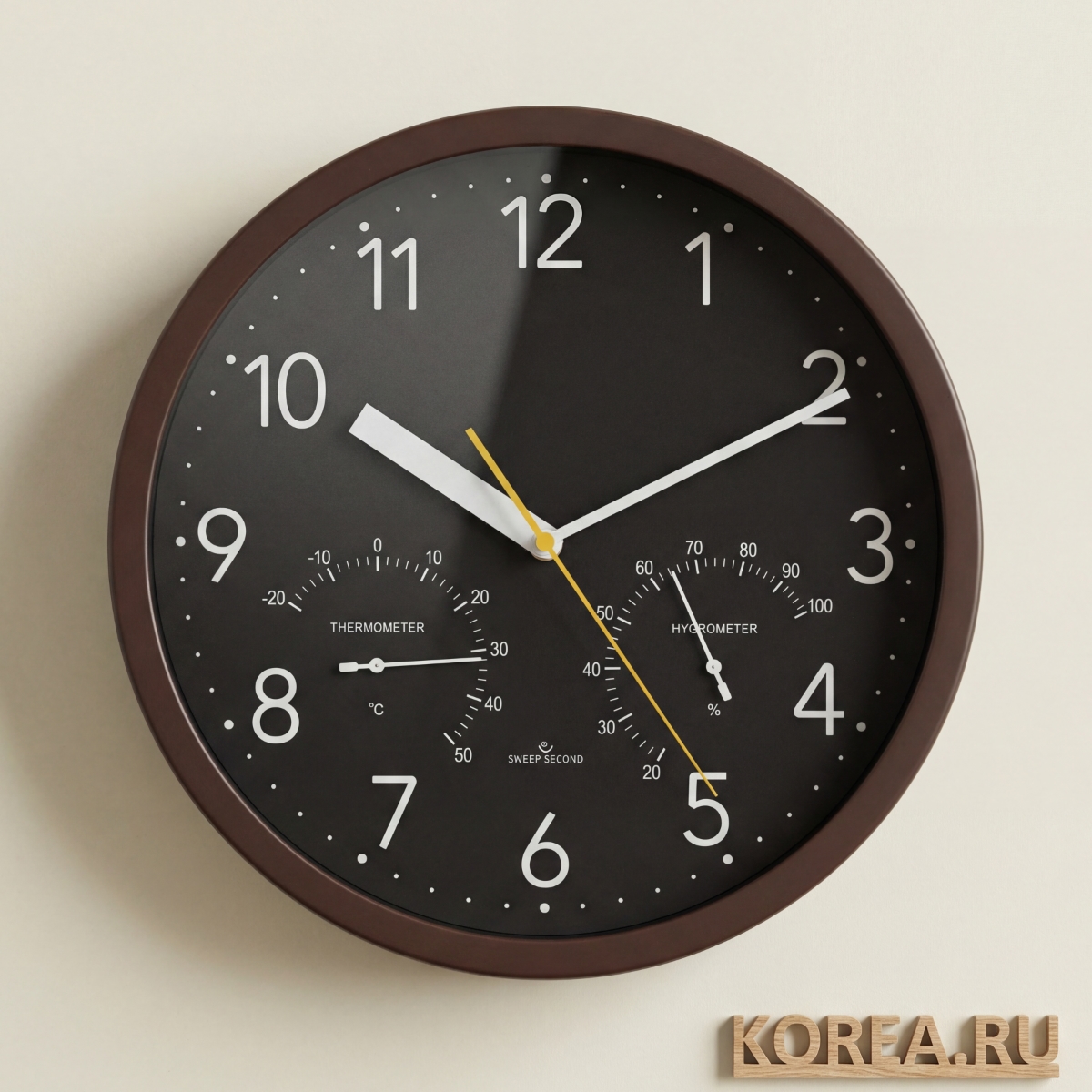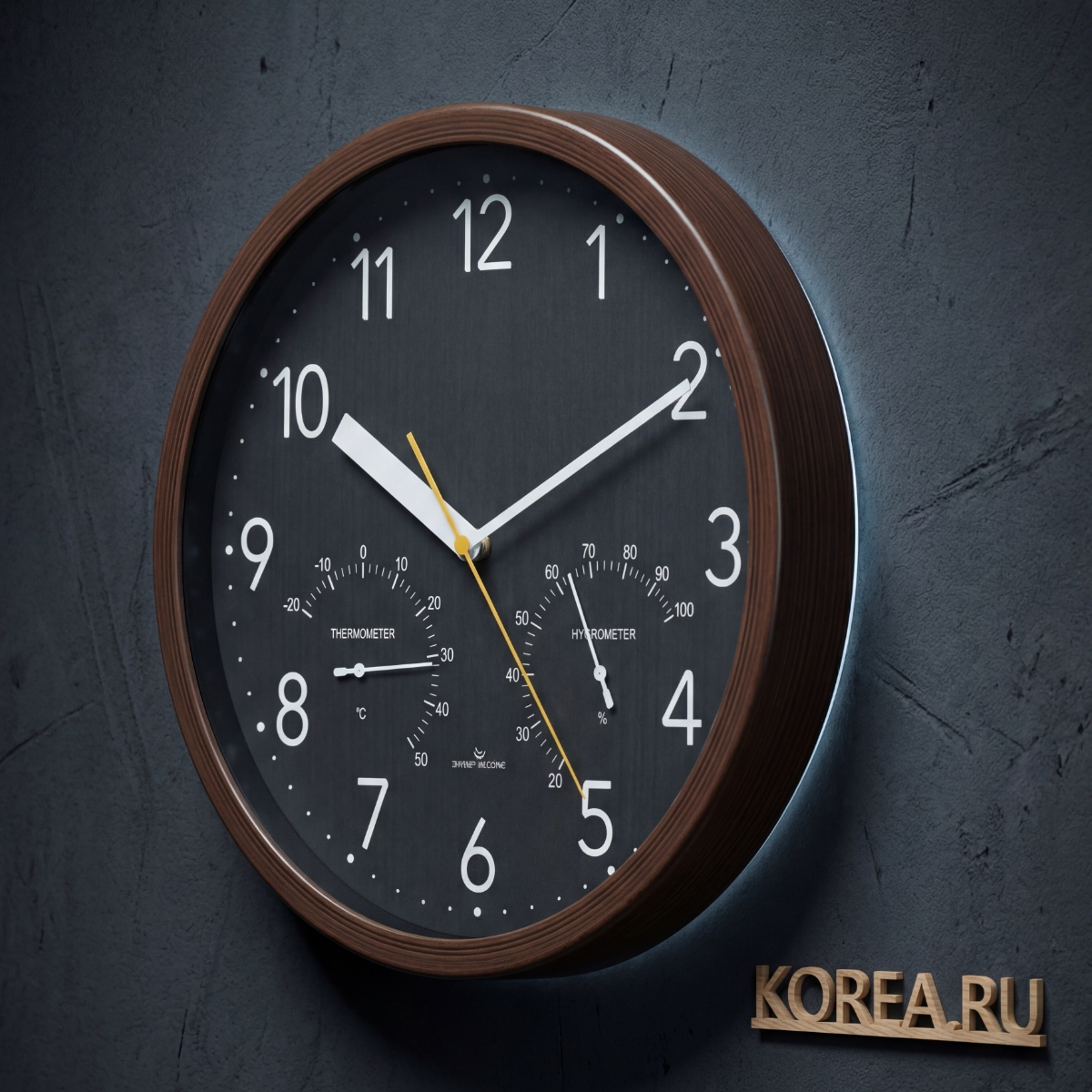 Дополнительные функции: интегрированные в циферблат гигрометр и термометр позволяют не только следить за временем, но и контролировать влажность и температуру воздуха в помещении. Эта опция особенно полезна для офисных работников, так как оптимальные показатели температуры и влажности благоприятно влияют на самочувствие и работоспособность.