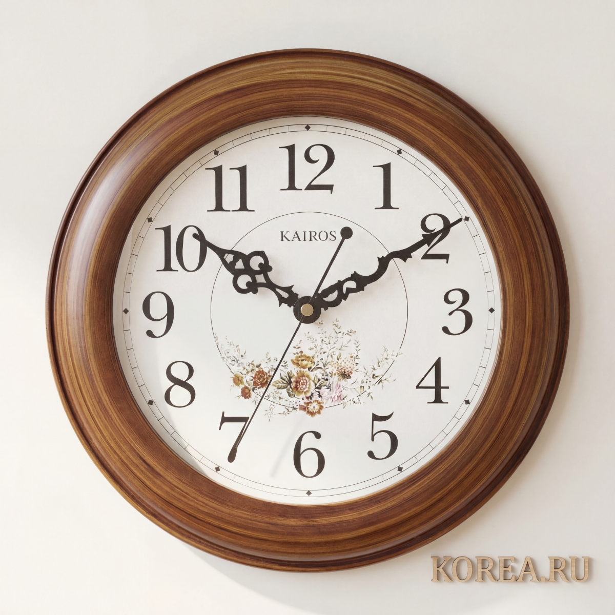 KAIROS KS362-1 выполнены в классическом стиле с легкими винтажными мотивами. Коричневый оттенок МДФ корпуса, напоминающий натуральное дерево ореховой расцветки, придает часам теплоту и традиционный характер. Декоративный элемент на циферблате в виде сухоцветов или ботанического орнамента добавляет особую нежность и романтичность изделию.