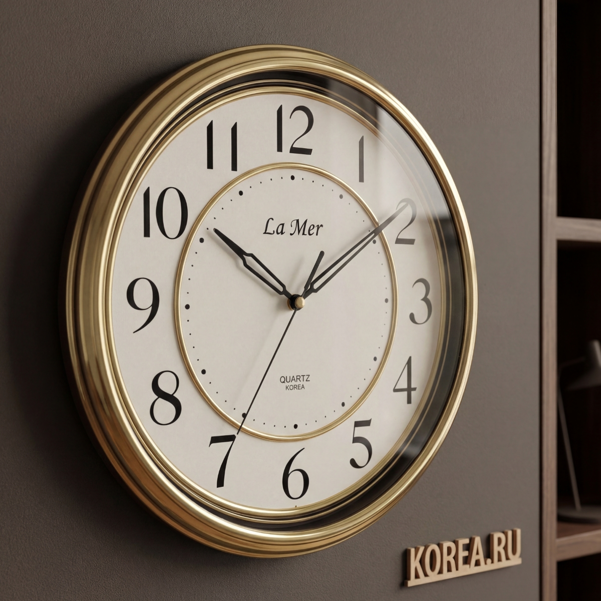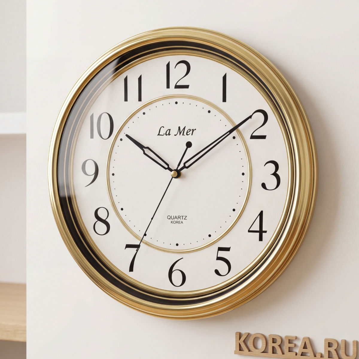Корпус часов изготовлен из прочного пластика, окрашенного в благородный золотой цвет. Эта отделка создает впечатление дорогого аксессуара, при этом обеспечивая легкий вес и простоту в монтаже. Пластиковое основание устойчиво к влаге и не требует специального ухода — достаточно протирать мягкой сухой тканью.
