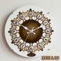 Циферблат часов украшен изящным золотистым орнаментом с растительными мотивами, что придает изделию премиальный вид. Белые стрелки с контрастным черным центром легко читаются при любом освещении. Фигурные накладки вокруг цифр в золотом исполнении создают объем и глубину, делая часы визуально интересным элементом декора.
