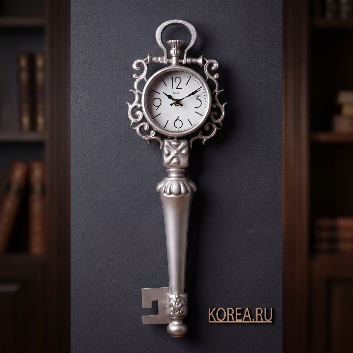 Габариты часов составляют 600×195×65 мм. Высокий вытянутый корпус подчёркивает форму ключа и визуально «вытягивает» пространство, поэтому часы отлично смотрятся на свободной стене, между дверными или оконными проёмами, над консолью или комодом.