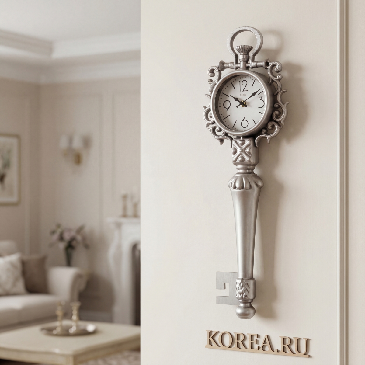 - Выразительный дизайн в форме ключа — часы становятся главным акцентом на стене.