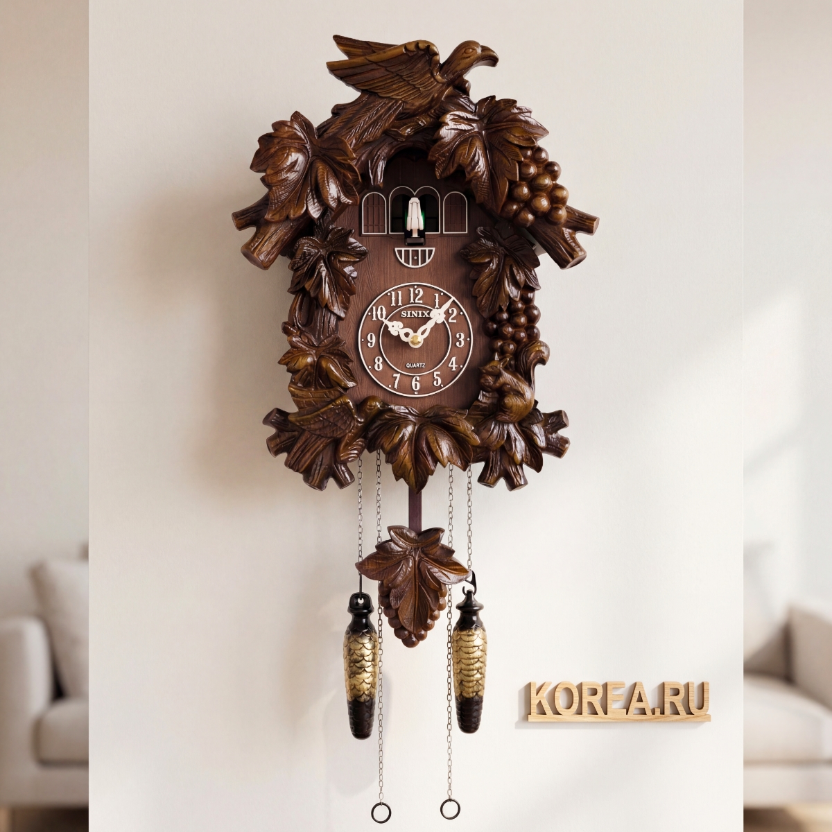 Кукушка с живыми движениями: При срабатывании кукушка взмахивает крыльями и открывает клюв, создавая реалистичный и привлекательный эффект. Материал кукушки — пластик, что гарантирует долговечность и легкость в уходе.
