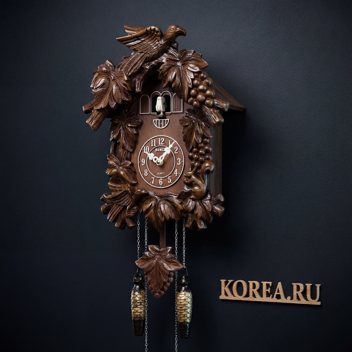 Верхняя часть украшена резной деревянной птицей и листьями, что придает часам аутентичный и элегантный вид. Черный циферблат с белыми цифрами обеспечивает хорошую читаемость времени. Часы защищены прозрачным стеклом, которое защищает циферблат от повреждений при сохранении видимости.
