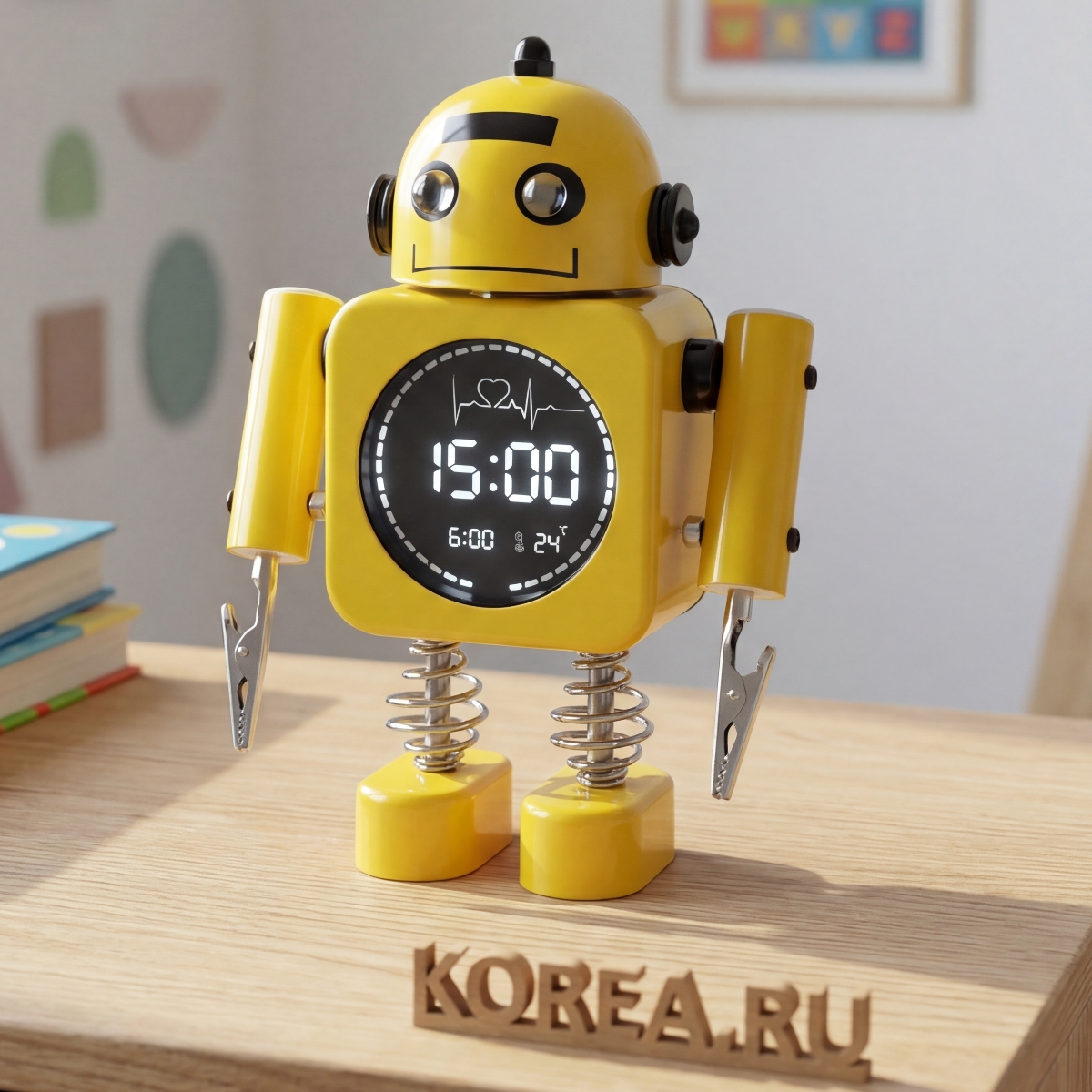 Размеры и конструкция: компактные размеры делают часы удобными в размещении на полке, прикроватной тумбочке или столе. Несмотря на небольшой размер, модель выглядит объемной и заметной благодаря трехмерной форме робота с деталями (имитация ушей, рук с инструментами).
