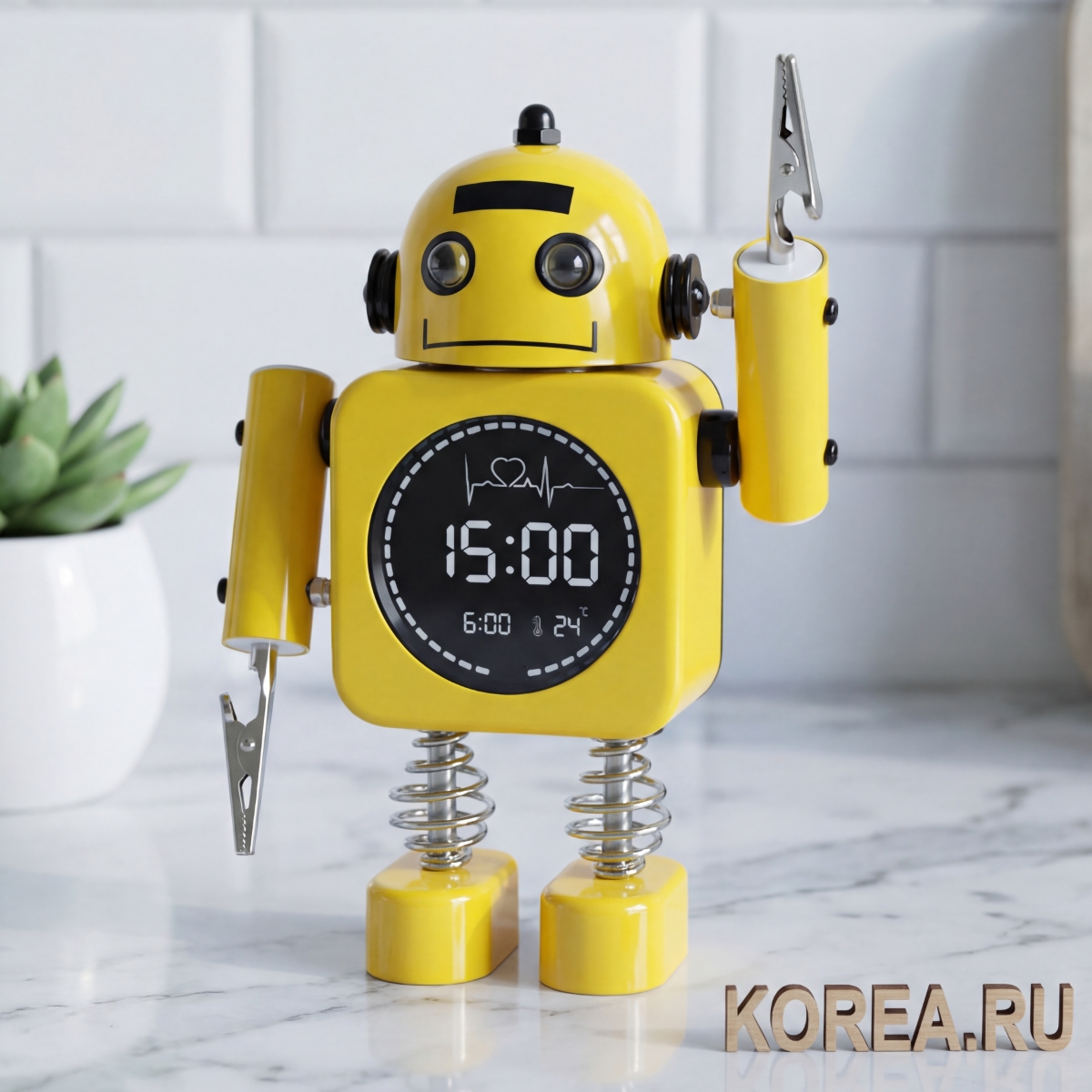 Стиль поп-арт и современный гламур: яркий желтый робот подойдет для комнат, оформленных в стиле поп-арт, футуризма или современного гламура. Часы станут смелым акцентом в интерьере.