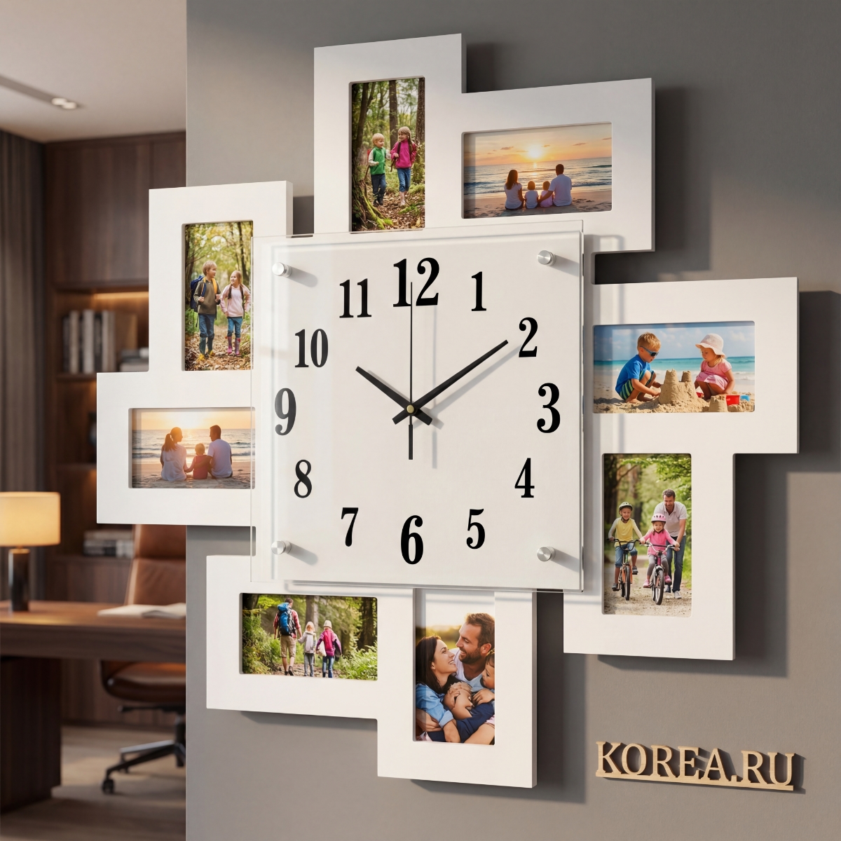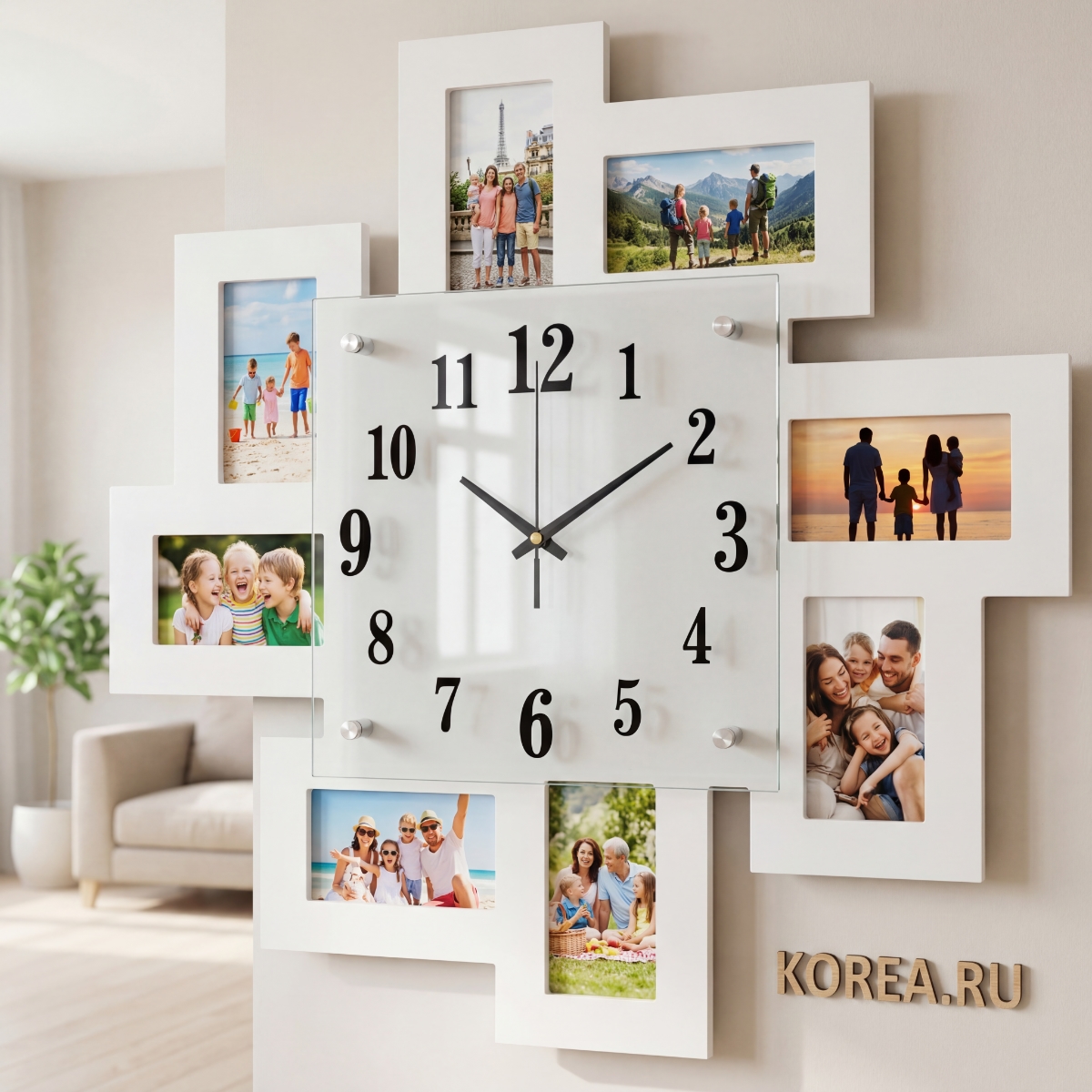 Центральный циферблат со стрелками гармонично расположен в композиции, окружённый восемью рамками для фотографий. В каждую рамку можно поместить фотографию, создавая экспозицию семейных воспоминаний, пейзажей или избранных кадров.