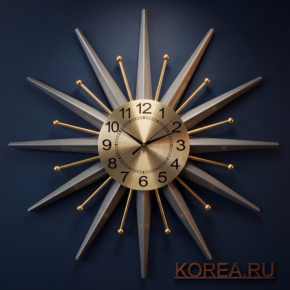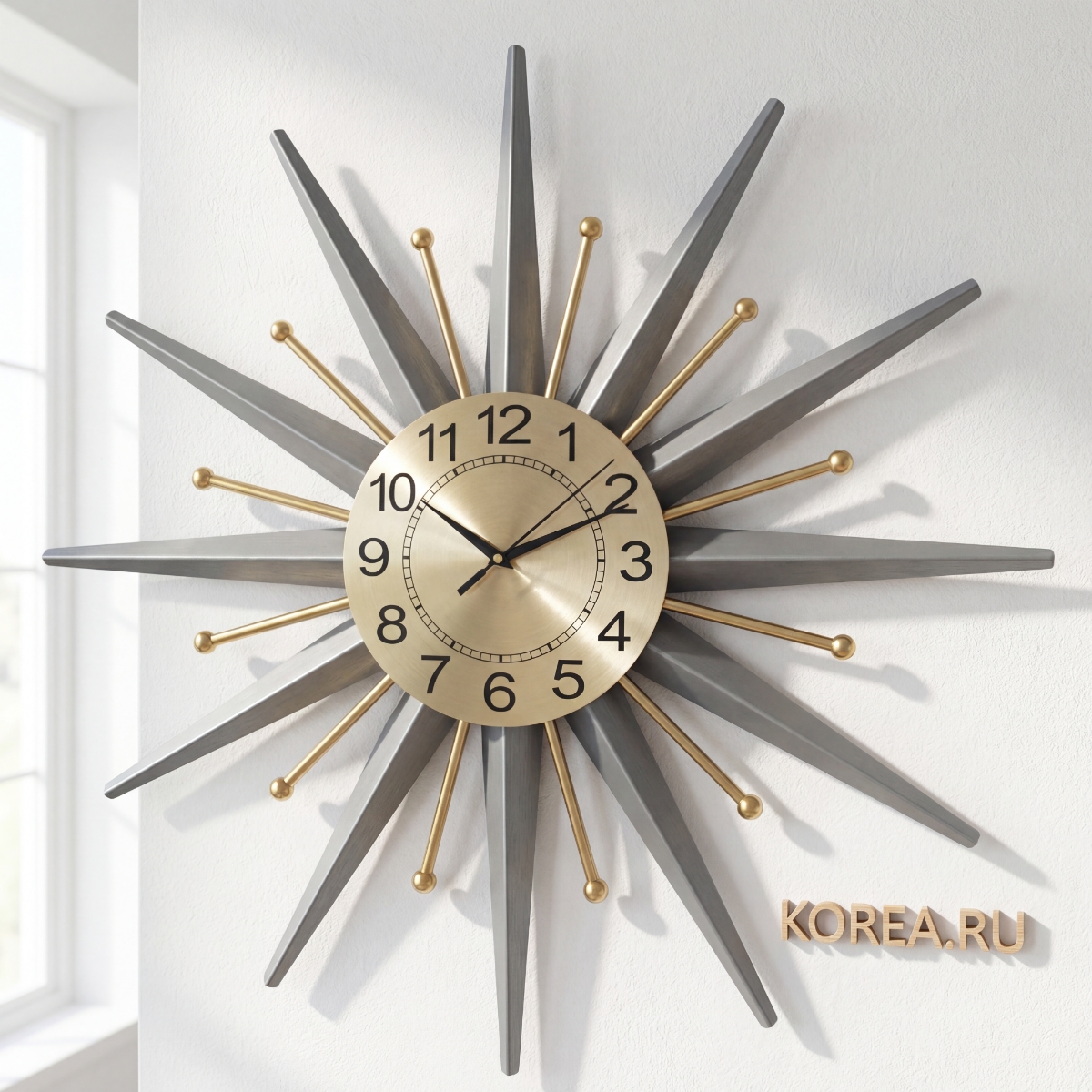 Корпус часов изготовлен из качественного металла, что обеспечивает долговечность и надежность конструкции. Комбинация золотистого циферблата и серых металлических лучей создает контрастный, гармоничный дизайн. Циферблат украшен арабскими цифрами, что облегчает чтение времени и добавляет элегантности.