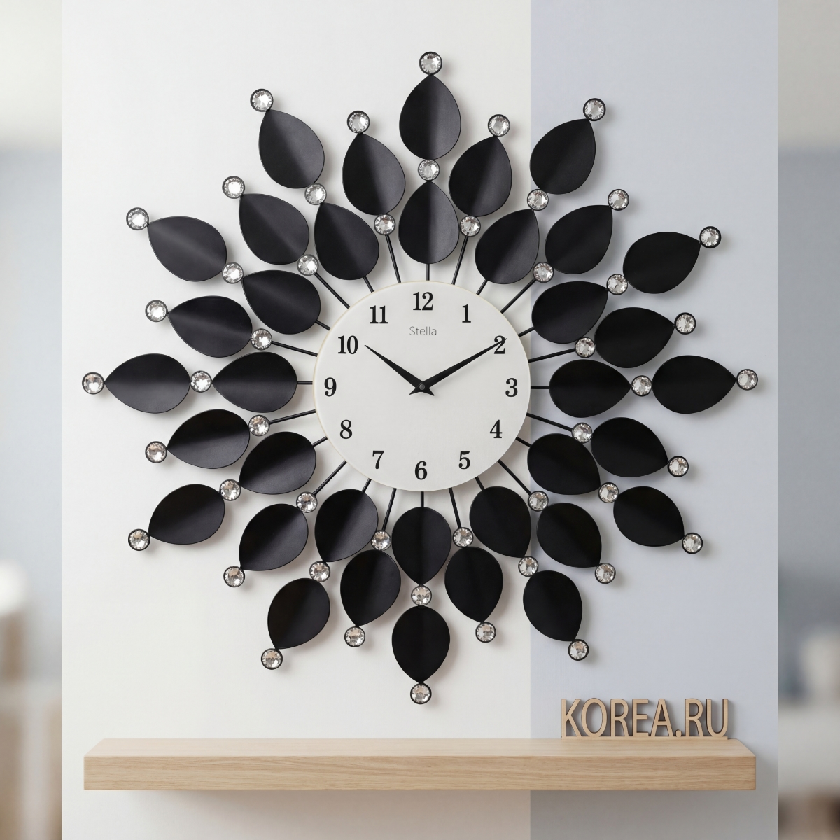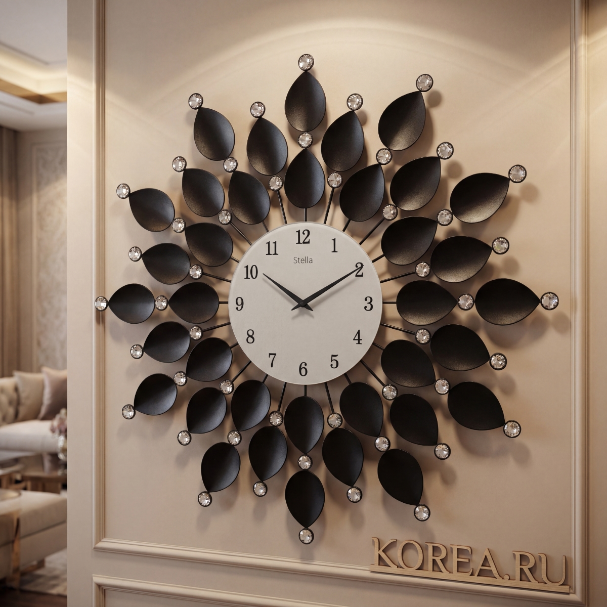 Эстетический потенциал: Крупные чёрные подвески вокруг циферблата в сочетании с хромированными кристаллами создают эффект роскоши и торжественности. Это создаёт выразительный силуэт, который привлекает взгляд и становится центром внимания стены.